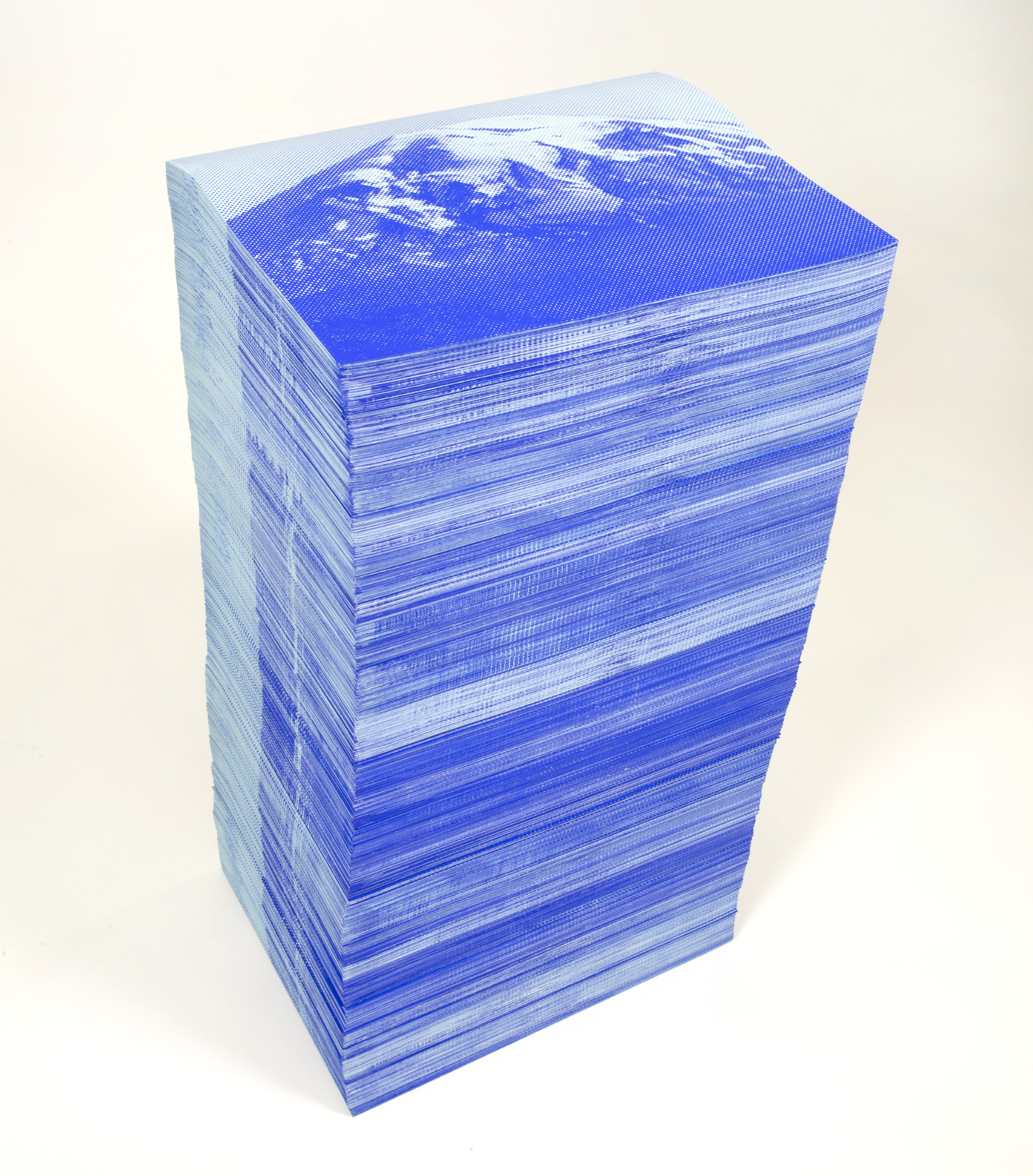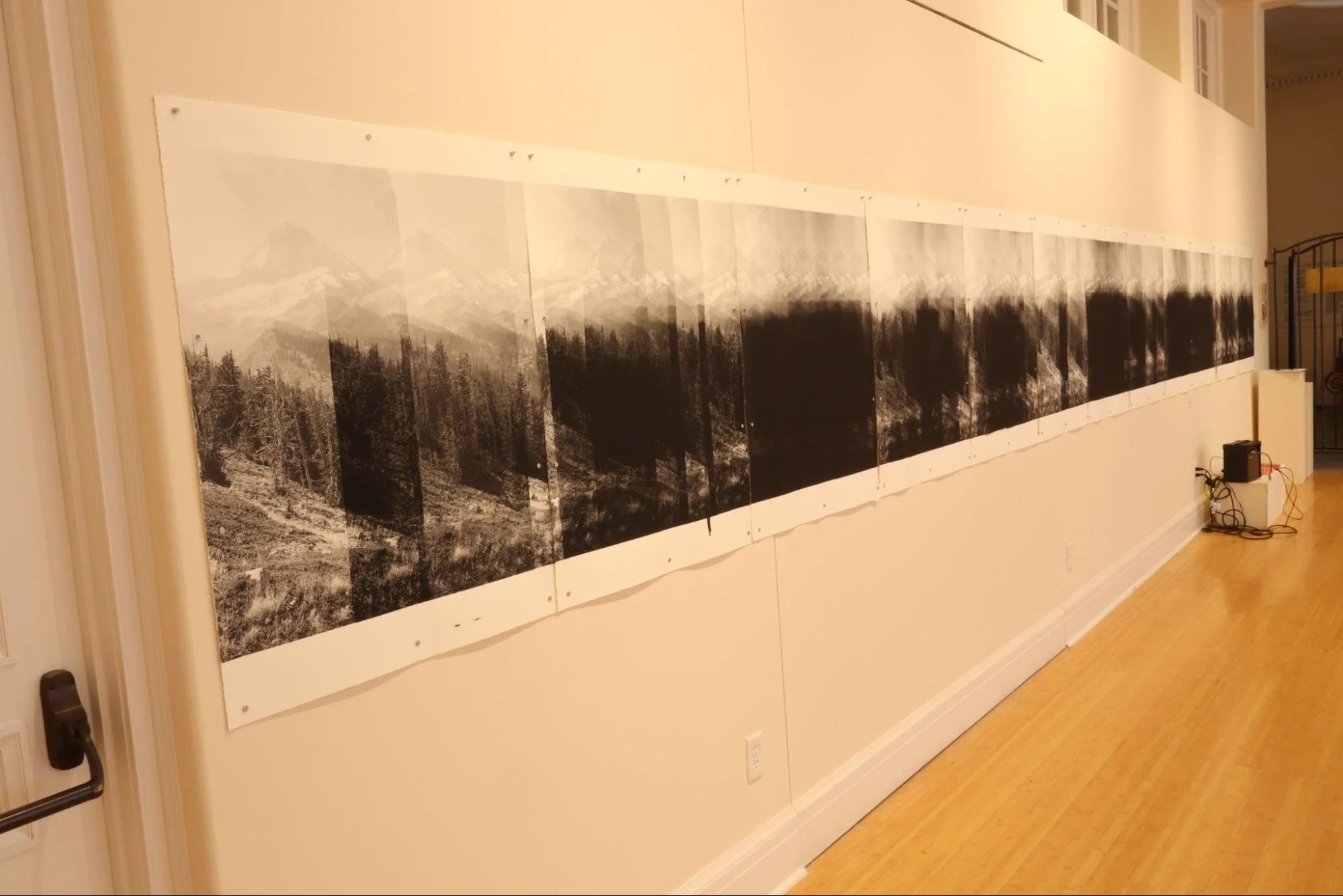 What instead could be found lacking? A quality of reverence? A faulty faculty of perception of mountainness itself? Surely, surely. Peet’s mountains shoulder this representational burden. In a recent installation, these peaks have been made to stumble and stretch across an entire gallery wall. A single image repeats; the mountain skitters and trembles in a manic lateral and duplicating dance. I’ve never seen a mountain multiply before. By Peet’s humble human hands I’m made aware of the complete incompleteness of my gaze.