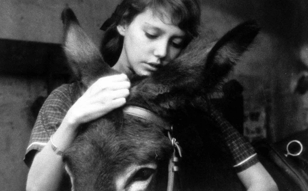 Robert Bresson's Au hasard Balthazar (1966) opens with a tenderness that the world of the film will not allow to last. The donkey Balthazar is baptized by children — Marie among them — who love him with the unselfconscious grace of the not-yet-worldly. That sojourn in innocence is brief. Balthazar passes into the hands of a succession of owners–some indifferent, most cruel. Marie passes into the human world through the loss of her childhood love. From that point Marie’s story and Balthazar's run alongside each other, delivered into a world ruled by men who are the true beasts — Gérard, who takes Marie by force, and the miller, who offers false shelter before trading her back to her parents like livestock. Predatory and falsely protective, they are the destructive and self-preservative faces of the same sovereign power over life.