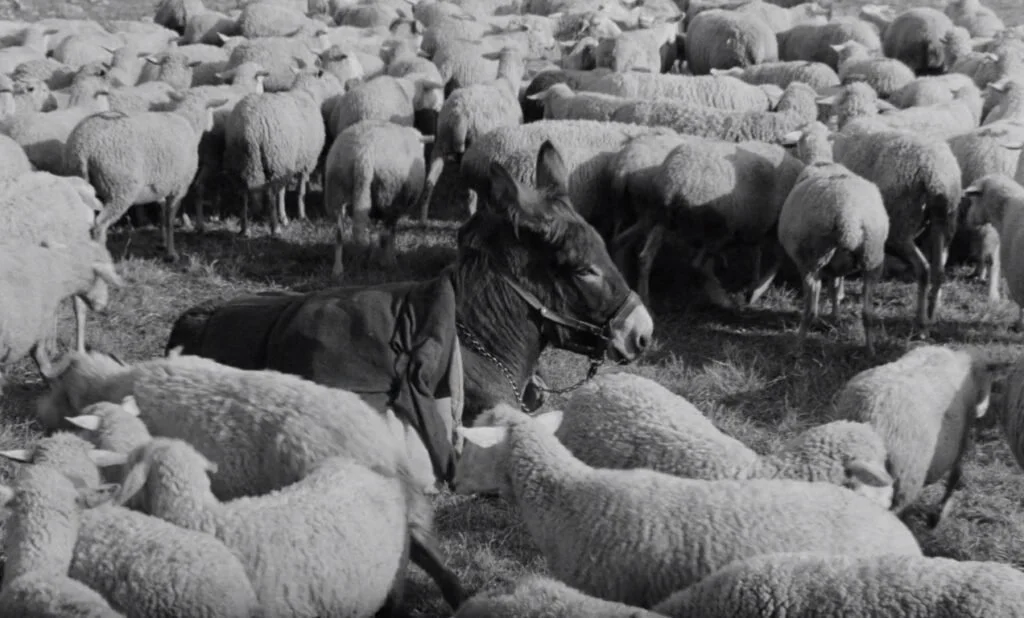 The final scene is even more haunting. Gérard's gang uses Balthazar one last time — to carry contraband across the mountains at night — then abandons him in the crossfire. By morning he is alone on the hillside, bleeding, his wounded flank catching the light. He wanders, slows, and sinks down among a flock of sheep. Their bells, recurring throughout the film, ring around him like an accidental funeral liturgy. There is no human witness, no imposed meaning, only the flock, the hillside, the sound, and then stillness. Marie, too, has by this point disappeared — abandoned by a world that will not mourn her passage through it. The two endings rhyme without quite touching — each unredeemed, each spent, leaving no residue of meaning or recognition. What makes Balthazar's death so intolerable is precisely the gentle indifference surrounding it: not cruelty, just the world continuing. Any grace in that moment belongs entirely to us the viewers, projected onto an animal with no access to it — which may be Bresson's most devastating suggestion of all.